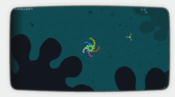 自機は数色の面と触手で構成されています。面や触手が同じ色のエネミーに触れるとそのエネミーを吸収して、触手が1個分伸びます。違う色のエネミーに触れると、触れた場所から触手がちぎれて、ライフが1つ減ります。