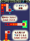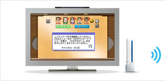 ダウンロードすると、「まる」「ぼう」「しかく」の3つのゲームがWiiで遊ぶのと同じルールでDS本体でも遊べるようになり、 いつでもどこでも『まるぼうしかく』が楽しめるようになります。 ゲームのダウンロードは何度でも可能です。(DSの電源を切ってしまうと、ゲームは消えてしまいます。) |