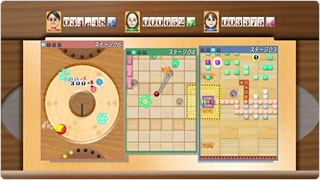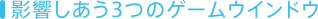 | プレイヤーは画面中央に並んだ3つのゲームウインドウのうち、1つを使ってゲーム開始。 空いているゲームウインドウでは、別のプレイヤーがゲームを始めたり、自動的にゲームの様子が再生されたりして、他のゲームが進行します。 別々に遊んでいても、倒した敵が隣のウインドウに飛んでいき敵を倒したり、アイテムに応じてゲームウインドウの大きさが変化したりと、プレイがお互いのゲーム展開に影響を与えます。 複数のプレイヤーでお互いに協力したりじゃまをしたりといった楽しみ方が可能です。 |