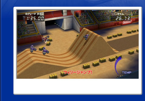 ファミコンからWiiウェアに : ベースとなっている『エキサイトバイク』は、1984年11月30日にファミリーコンピュータで発売され、後に、ゲームボーイアドバンスでもファミコンミニ※として復活しました。今回も当時の操作と同様、十字ボタンと2つのボタンを使った操作で遊ぶことができます。画面写真