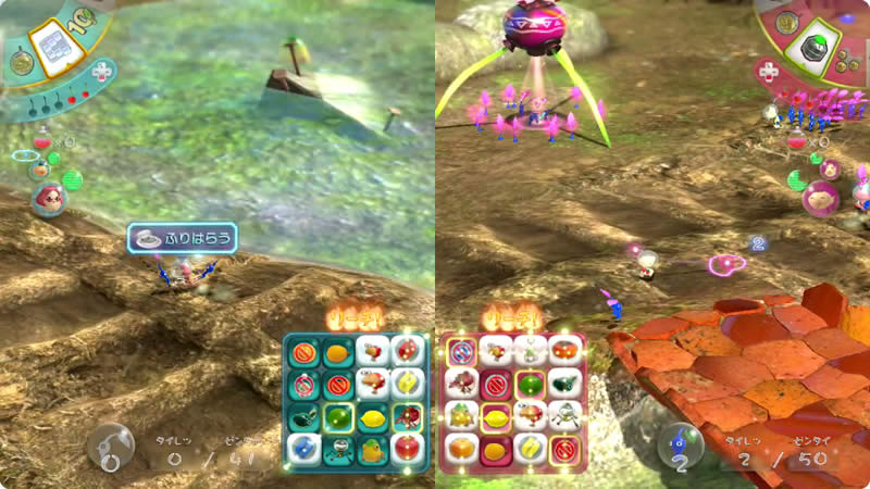 相手にピクミン 相手のピクミンに自分のピクミンを投げると、邪魔をしたり横取りしたり。さらに相手にピクミンを投げると、相手にくっついて邪魔をします。