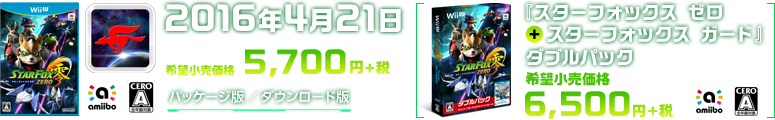2016年4月21日 通常版 希望小売価格:5,700円+税 パッケージ版/ダウンロード版 『スターフォックス ゼロ+スターフォックス ガード』ダブルパック 希望小売価格:6,500円+税 amiiboCERO A:全年齢対象CERO A:全年齢対象 amiibo