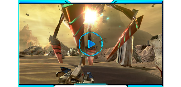 テレビ画面に映る自機の三人称視点のほかに、Wii U GamePadにはコックピットからの一人称視点が表示。機体の操縦は左右のスティックで、レーザーの照準は、Wii U GamePadのジャイロ操作で直感的に操作が可能です。ジャイロ操作とスティック操作を組み合わせて、臨場感のあるプレイを楽しむことができます。