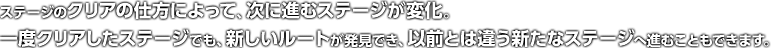 ステージのクリアの仕方によって、次に進むステージが変化。一度クリアしたステージでも、新しいルートが発見でき、以前とは違う新たなステージへ進むこともできます。