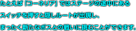 たとえば「コーネリア」ではステージの途中にあるスイッチを押すと隠しルートが出現し、まったく新たなボスとの戦いに挑むことができます。