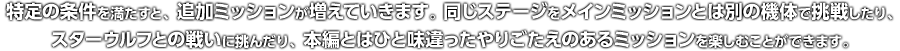 特定の条件を満たすと、追加ミッションが増えていきます。同じステージをメインミッションとは別の機体で挑戦したり、スターウルフとの戦いに挑んだり、本編とはひと味違ったやりごたえのあるミッションを楽しむことができます。