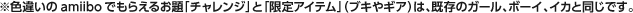 ※色違いのamiiboでもらえるお題「チャレンジ」と「限定アイテム」(ブキやギア)は、既存のガール、ボーイ、イカと同じです。