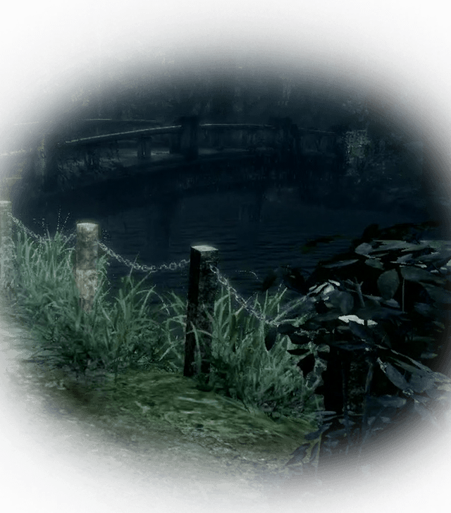 参拝マップその13 水籠橋・水籠池 日上山から流れ落ちる水を湛える池。山の水は水籠池を通ってさらに麓へと流れていく。その為一年を通して水質は良く、観光地となっていた当時は、周辺の遊歩道や水籠橋を散策する人も多くあった。参道に続く橋「水籠橋」は山へと入る境界として位置づけられていた。古くは木造だったが、一縷荘の新館建築の際にコンクリート製のものへと架け替えられた。