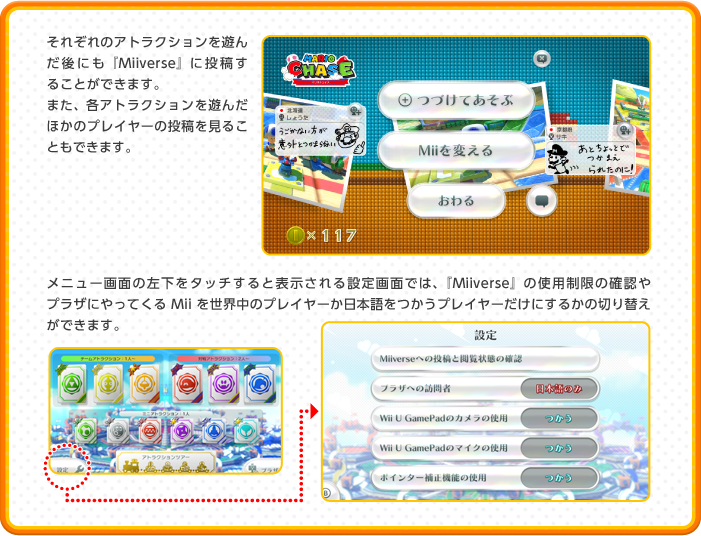それぞれのアトラクションを遊んだ後にも『Miiverse』に投稿することができます。また、各アトラクションを遊んだほかのプレイヤーの投稿を見ることもできます。メニュー画面の左下をタッチすると表示される設定画面では、『Miiverse』の使用制限の確認やプラザにやってくるMiiを世界中のプレイヤーか日本語をつかうプレイヤーだけにするかの切り替えができます。