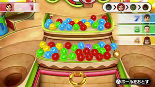 ゲーム台にボールを投入し、台にあるボールを落として得点を競います。ミニゲームでの順位が高いと、投入できるボールの数が増えます。金色のボールを落とすとボーナス点が入りますが、ドクロのボールを落とすと減点になってしまいます。