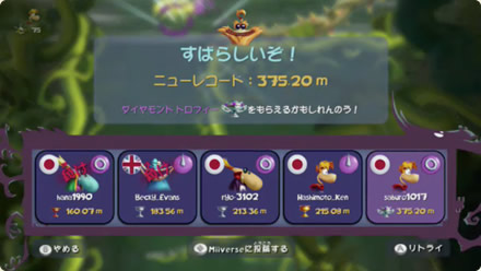 コースに挑戦すると、みんなの記録と自分のランキングを確認することができます。コース内では、上位記録者たちのゴーストと競争することも可能。