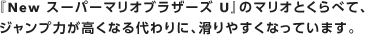 『New スーパーマリオブラザーズ U』のマリオとくらべて、ジャンプ力が高くなる代わりに、滑りやすくなっています。