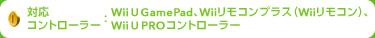 対応コントローラー:Wii U GamePad、Wiiリモコンプラス(Wiiリモコン)、Wii U PROコントローラー
