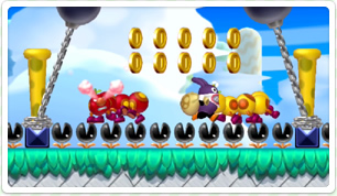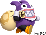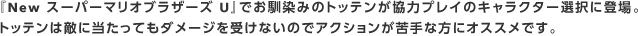 『New スーパーマリオブラザーズ U』でお馴染みのトッテンが協力プレイのキャラクター選択に登場。トッテンは敵に当たってもダメージを受けないのでアクションが苦手な方にオススメです。
