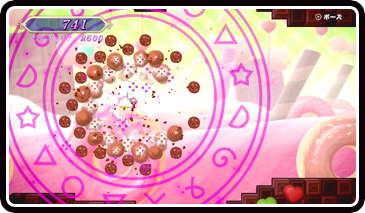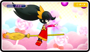 アシュリー 1人用 お菓子の世界でまほう力を集めて進む 横スクロールのシューティングゲーム 空飛ぶホウキにまたがる魔法使いアシュリーと協力して、お菓子の世界からの脱出をめざします。