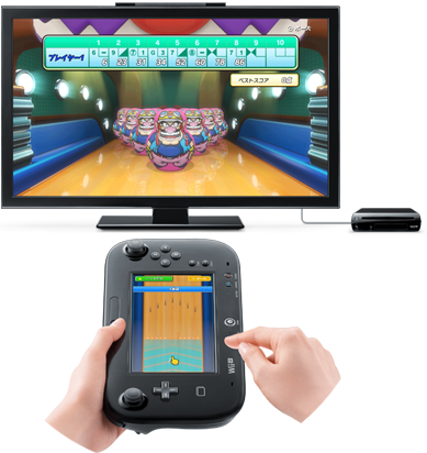 • Wii U GamePadをどう使う? GamePadをタテにかまえ、タッチスクリーンのボールをはじいて投球します。GamePadを左右に傾けると、ボールの軌道を左右に変えられます。