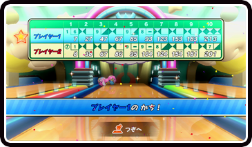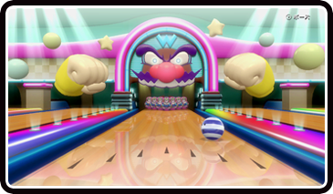ボウリング 1〜2人用 タッチスクリーンをスライドして投球!GamePadを傾けてねらえストライク!! ワリオたちが描かれたピンを倒すボウリングゲームです。特殊なカタチで配置されたピンを、たった1投で倒していきます。オーソドックスなルールで10フレーム目までのスコアを競うモードでは、1人でじっくり遊ぶほか、2人で交互にプレイして対戦することもできます。