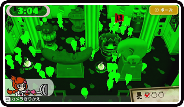 • Wii U GamePadをどう使う? 怪盗役 GamePadでキャラクターを操作し、制限時間内に決まった数のフルーツを盗みます。GamePadの画面をGメン役に見られないように注意。 Gメン役 回答する順番が回ってきたら、怪盗役扮するキャラクターを選択します。
