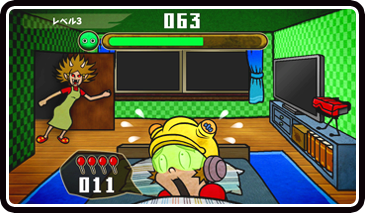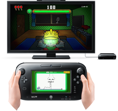 • Wii U GamePadをどう使う? テレビ画面にはナインボルトの部屋のようす、GamePadには『バルーンファイター』のプレイ画面が映し出されます。お母さんの気配が近づいたら、すかさずボタンを押して寝たふりをします。