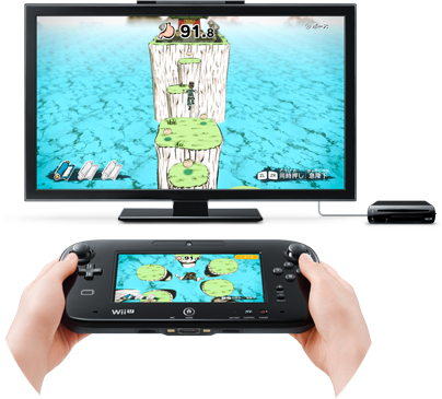 • Wii U GamePadをどう使う? 水平に持ったGamePadを奥や手前、左や右にかたむけて、クリケットを足場から足場へと渡らせます。