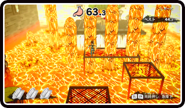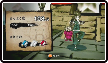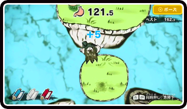 カンフー 1人用 前方注意、足元確認、師匠のもとまで連続ジャンプ テレビで前方を見通して、Wii U GamePadで足場を確認しながら、ジャンプしているクリケットをマンティスのもとまでたどり着かせます。まんぷく度の減りには注意!周りで見ている人が前方の状況を教えてあげることで、プレイヤーは手元の画面に集中することができます。