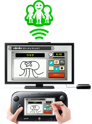 スケッチする 4つのお題から1つを選び、制限時間(60秒)内にスケッチします。「できた!」をタッチするか、制限時間が過ぎると、スケッチした絵がMiiverseに投稿されます。 作品をみる 「自分がスケッチした絵」や「自分のお題をもとに、ほかのプレイヤーがスケッチした絵」、「Miiverseで最近話題の絵」が見られます。 お題を投稿する 最大8文字のお題を考えて投稿します。あなたのお題で見知らぬ誰かがスケッチしてくれるかも!