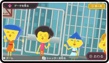 シャッター 1人用 ターゲットを見つけてかまえて、スクープゲット! テレビに映っているステージから、5人のターゲットを見つけてWii U GamePadで撮影。写真のできによって点数が変わります。めずらしいイキモノの写真を撮るとボーナスも!