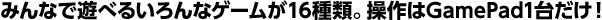 みんなで遊べるいろんなゲームが16種類。操作はGamePad1台だけ!