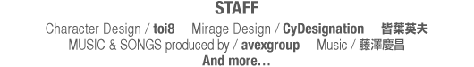 STAFF Character Design / toi8     Mirage Design / CyDesignation     皆葉英夫     MUSIC & SONGS produced by / avexgroup     Music / 藤澤慶昌 And more…