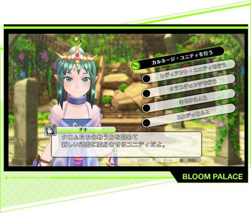 チキが住む幻想的な施設「ブルームパレス」。ミラージュたちのいた異世界を模したかのような景色が広がるこの施設は、クロムたちミラージュと、樹たちミラージュマスターに強化を施すことができる、このゲームのシステム的な中核を担う重要拠点だ。
