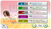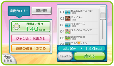 目標体重と達成までの期間を設定すると、『Wii Fit U』が1日の目標消費カロリーを計算します。また、フィットメーターから転送された消費カロリーが目標に満たなければ、「おまかせメニュー」でおすすめのトレーニングメニューをご提案します。