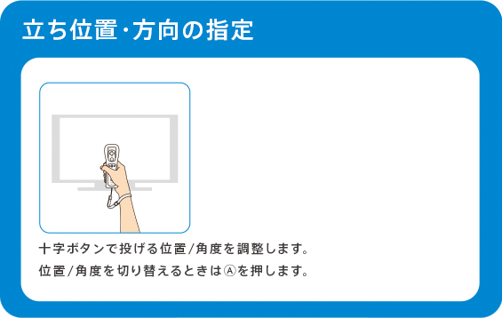 十字ボタンで投げる位置/角度を調整します。位置/角度を切り替えるときはAボタンを押します。