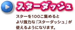 • スターダッシュ スターを100こ集めるとより強力な「スターダッシュ」が使えるようになります。