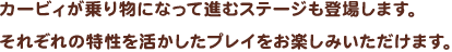 カービィが乗り物になって進むステージも登場します。それぞれの特性を活かしたプレイをお楽しみいただけます。