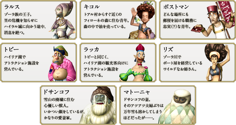 - ドサンコフ:雪山の廃墟に住む心優しい獣人。いかつい顔をしているが、かなりの愛妻家。