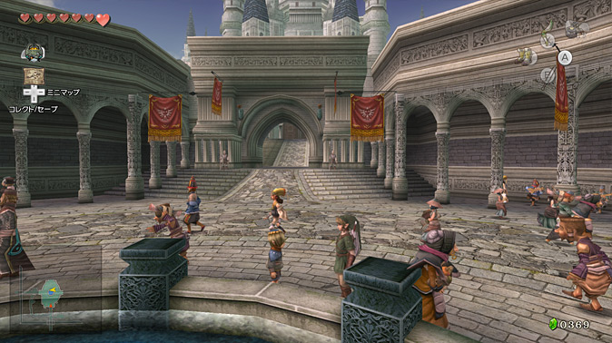 ハイラルの中心部であり、たえずにぎわっている。広場を越えた先には、王国の象徴である巨大な城、ハイラル城がそびえる。