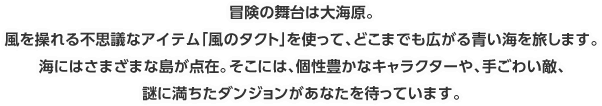 冒険の舞台は大海原。風を操れる不思議なアイテム「風のタクト」を使って、どこまでも広がる青い海を旅します。海にはさまざまな島が点在。そこには、個性豊かなキャラクターや、手ごわい敵、謎に満ちたダンジョンがあなたを待っています。