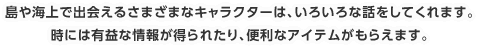 島や海上で出会えるさまざまなキャラクターは、いろいろな話をしてくれます。時には有益な情報が得られたり、便利なアイテムがもらえます。