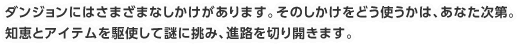 ダンジョンにはさまざまなしかけがあります。そのしかけをどう使うかは、あなた次第。知恵とアイテムを駆使して謎に挑み、進路を切り開きます。
