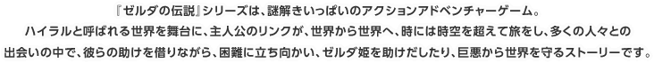 『ゼルダの伝説』シリーズは、謎解きいっぱいのアクションアドベンチャーゲーム。ハイラルと呼ばれる世界を舞台に、主人公のリンクが、世界から世界へ、時には時空を超えて旅をし、多くの人々との出会いの中で、彼らの助けを借りながら、困難に立ち向かい、ゼルダ姫を助けだしたり、巨悪から世界を守るストーリーです。