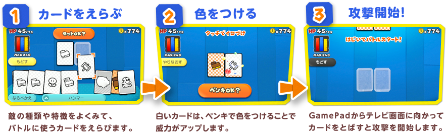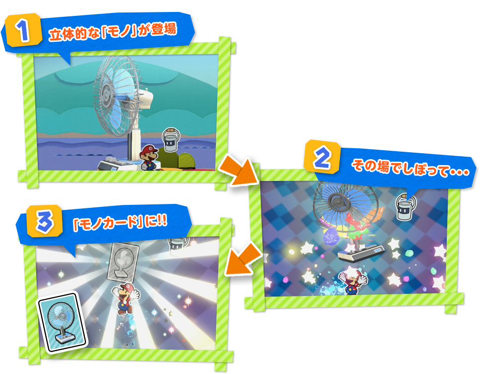 しぼった「モノ」は「モノカード」に変わり、しかけをといたり、バトルに使ったりできるようになります。