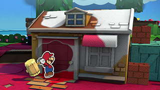 が表示されていたら、お花や木などをハンマーでたたいてペンキを手に入れよう。