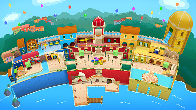 左から、アオイロ区、アカイロ区、キイロ区。手前がミナト区。ぼうけんを進めると行けるようになる場所もあるよ。