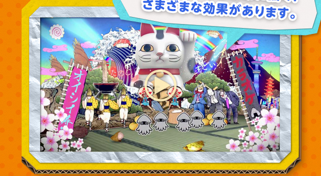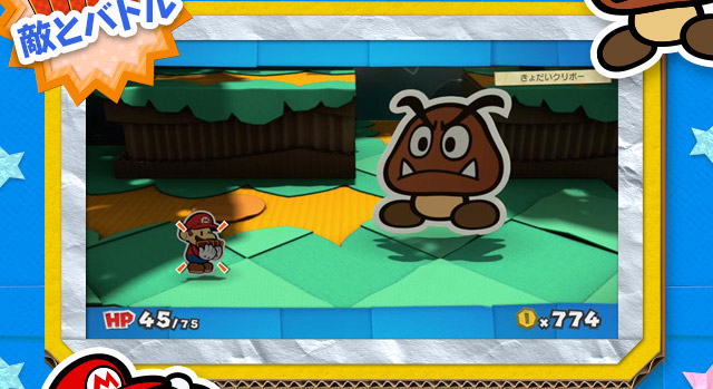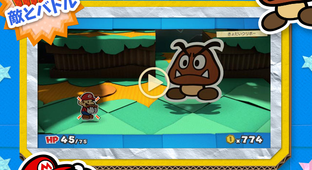 GamePadで… カードをえらぶ 色をつける 攻撃開始! タイミングよくボタンを押すと、攻撃の威力が上がったり、相手の攻撃をガードすることができます。 「モノ」と「モノカード」 ペラペラの紙の世界には、ときどき妙に立体的なアイテムが登場します。これは「モノ」と呼ばれ、その場でぞうきんのようにしぼることができます。 立体的な「モノ」が登場 その場でしぼって・・・ 「モノカード」に!! 「モノカード」に変わると しぼった「モノ」は「モノカード」に変わり、しかけをといたり、バトルに使ったりできるようになります。 「モノカード」は非常に強く、さまざまな効果があります。