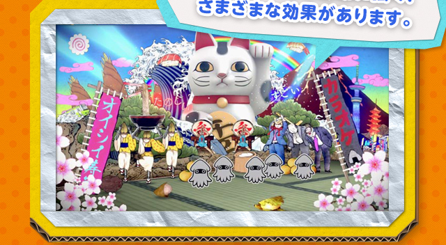 例えば、こんなカードがあります ノーマルカード 攻撃や回復に使う基本的なカードになります。大きなえがらほど強力です。 敵カード バトルで敵を倒すと、敵のカードをもらえることがあります。敵カードをバトル中に使うとそのキャラクターが登場して、敵に攻撃したり、敵からの攻撃をかわりに受けたりしてくれます。 モノカード モノカードを使うと、敵全体にダメージをあたえる強力な攻撃ができます。謎ときに使うことも?