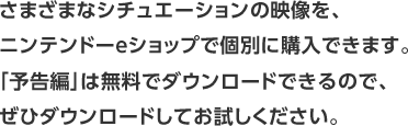 さまざまなシチュエーションの映像を、ニンテンドーeショップで個別に購入できます。「予告編」は無料でダウンロードできるので、ぜひダウンロードしてお試しください。※予告編の配信は終了いたしました。