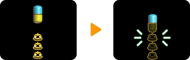 落ちてくるカプセルを回転させて並べます。ウイルスを含めて縦か横の1列に4つ以上同じ色を並べると、ウイルス(細菌)が消えます。ウイルス(細菌)を含めずに4つ以上同じ色をそろえて、カプセルのみを消すこともできます。カプセルがビンの上まで詰まるとゲームオーバーになります。
